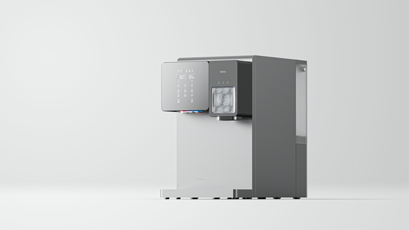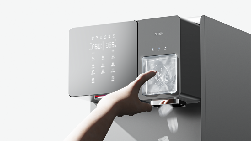 該機型為臺面式設計,無需專業安裝,使用方便,將傳統凈飲水機與制冰機功能整合,功能強大,體積小巧。整體設計風格極簡,理性克制,不浮夸,沉靜內斂。功能分區清晰明了易操作,在其強大的功能基礎上,極大降低使用難度,體現人文關懷。設計最大的亮點在于雙區操作形式,左區飲水,觸摸式大屏,自定義功能豐富;右區制冰,“大冰塊”物理出冰按鍵,操作一目了然。