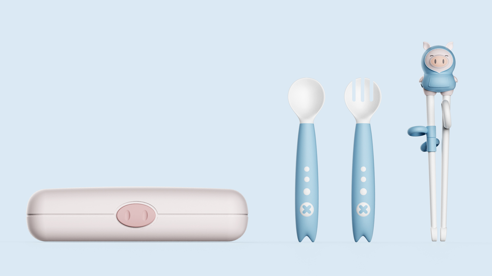 萌萌小豬的可愛學習筷,流暢飽滿的訓練叉勺,加上大氣精致的收納盒設計。整體有區別有相互有聯系,讓系列化產品更加有趣和豐富。單獨每一款產品也可以作為一個賣點,增加產品的附加值。